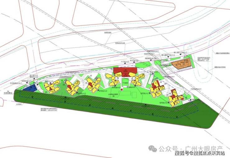 地块本身形状不算规则,像个剪刀叉,6.7万平的土地面积,只有3万平可用于建设,剩余1.7万平道路用地,2万平绿地用地,坊称海珠版“兰亭盛荟”