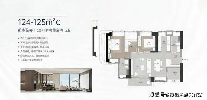 【124-125㎡ 3+1房2卫】C户型:横厅户型,双阳台设计。西北朝向(01)看绿地公园及花园