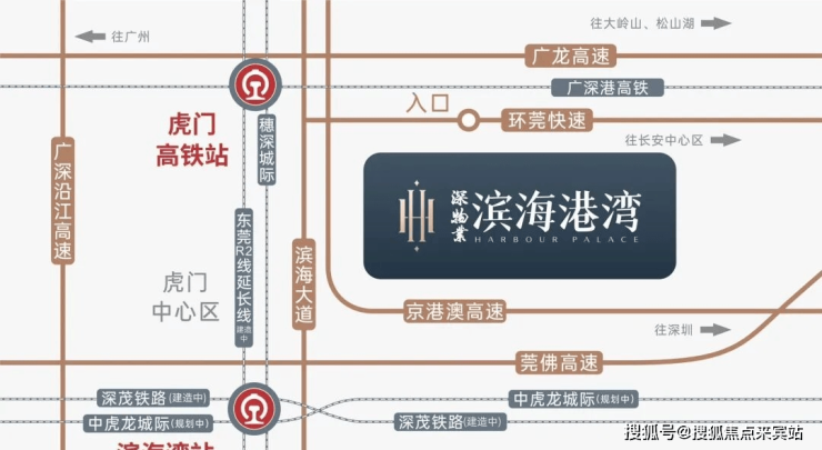 项目直线距离虎门高铁站仅约2.8公里,雄踞虎门TOD核心辐射区,扼守滨海湾大道都市创新轴线上,串联滨海湾、虎门新中心等核心区。