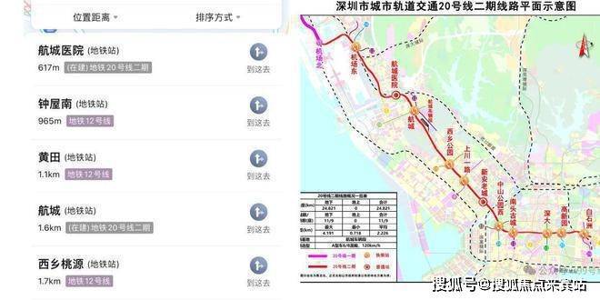 项目距离12号线钟屋南站约965m,距在建中的20号线航城医院站约617m(预计2028年通车)。若从航城医院站出发,4站可达宝安中心,8站可达南山高新园,对于在宝安、南山上班的朋友来说非常便利。