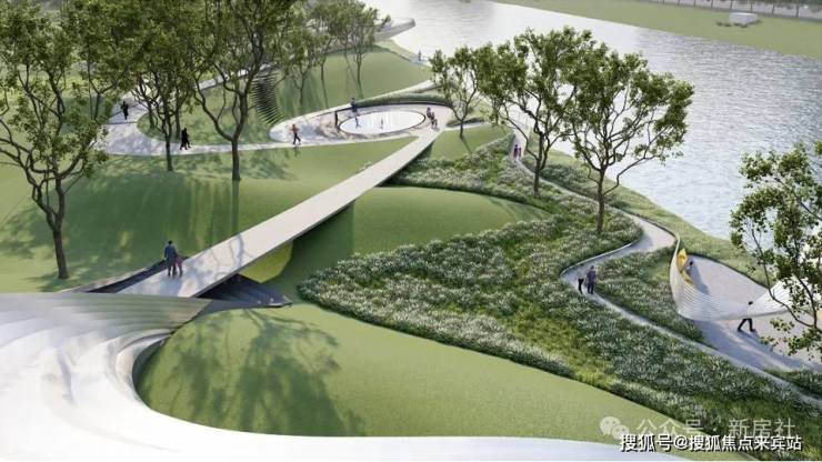 小区打造阶梯式生态公园柔化盖板垂直立面,构建“城-绿-水”交融的城市生态玄关。