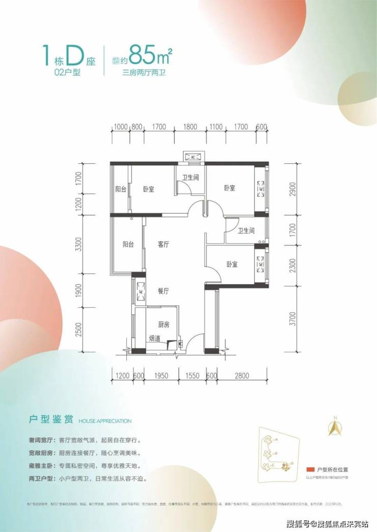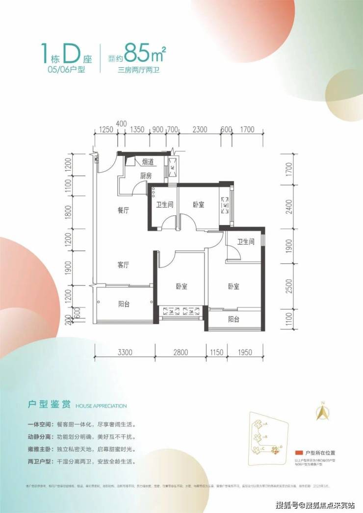 85㎡的3房2厅2卫,1栋D座05.06户型,设计的是经典竖厅格局,客厅3.3米开间,3个卧室分别做到了3.1米/2.8米/2.4米的宽度,客厅主卧双阳台设计,U型厨房,卫生间干湿分离,得房率:76.05%(不含赠送),阳台朝东南向,看楼岗大道。