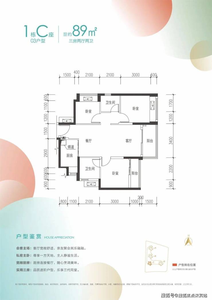 89㎡的3房2厅2卫,1栋C座03户型,设计的是竖厅双龙抱珠格局,客厅3.4米开间,3个卧室分别做到了2.9米/2.9米/2.5米的宽度,客厅主卧双阳台设计,L型厨房,卫生间干湿分离,得房率:76.78%(不含赠送),阳台朝东北向,看楼岗公园。