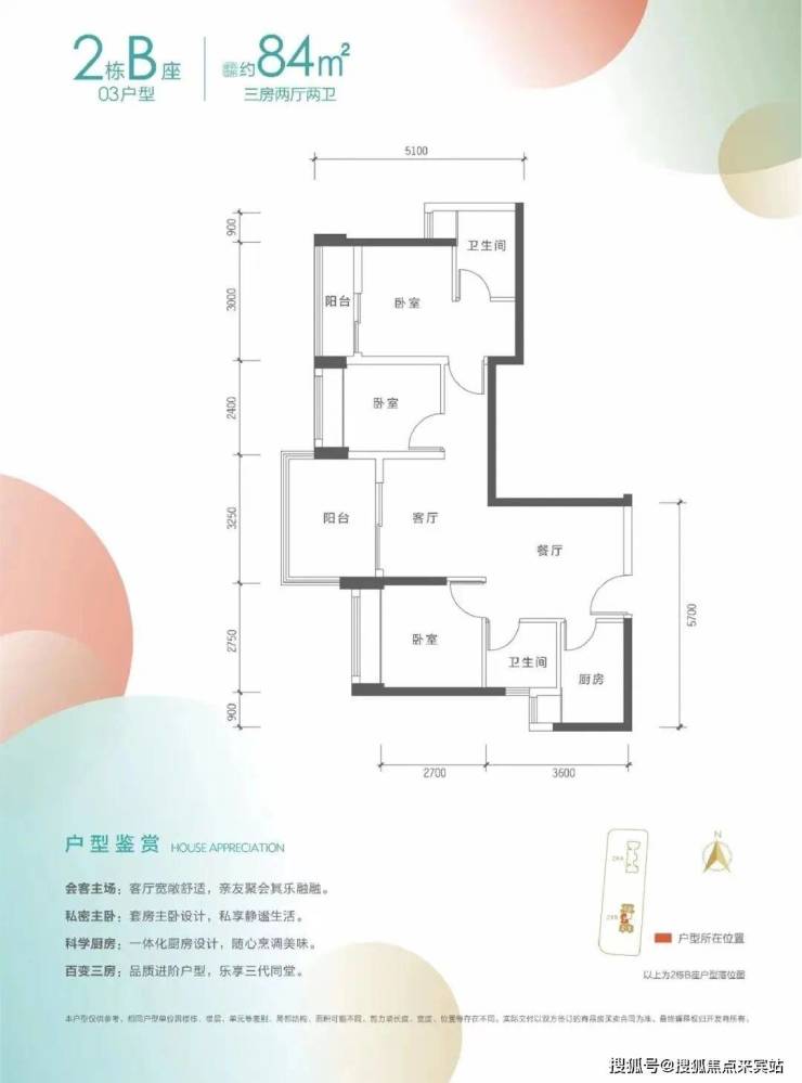 84㎡的3房2厅2卫,2栋B座03户型,设计的是新型竖厅格局,客厅3.25米开间,3个卧室分别做到了3米/2.75米/2.4米的宽度,客厅主卧双阳台设计,L型厨房,卫生间干湿分离,得房率:76.04%(不含赠送),阳台朝西向,看楼岗公园。