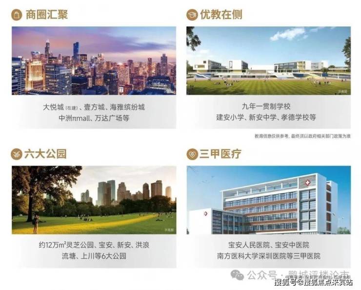以大悦城为核芯,形成3公里优质生活圈,集产业、商业、优教、公园、医疗等丰富功能于一体。项目自带九年一贯制学校、幼儿园,建安小学、新安中学、孝德学校等优教环伺;下楼即享约12万㎡灵芝公园,深圳西部最大的市政公园-宝安公园、新安、洪浪、流塘、上川等6大公园环绕。宝安人民医院、宝安中医院、南方医科大学深圳医院等三甲医院护航健康。