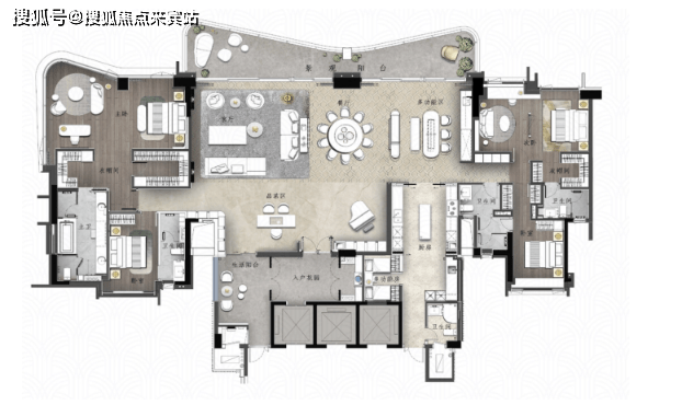 超16米开间尺度直面三江巨幕无界画境,超100㎡ “客厅-餐厅-多功能区-品茗区”一体化设计,承载生活与社交功能,为塔尖人士量身定制的极致社交场域。
