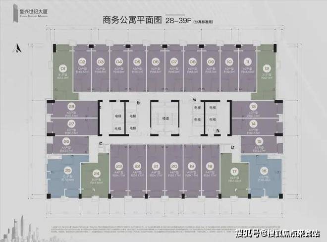 公寓8梯28户,办公6梯15户,商业4梯34户