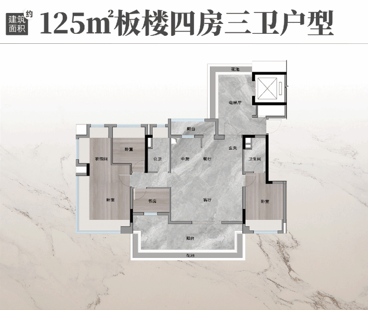 建面约125㎡,更是四房带双主套的板楼户型,拥有比肩豪宅的居住品质。