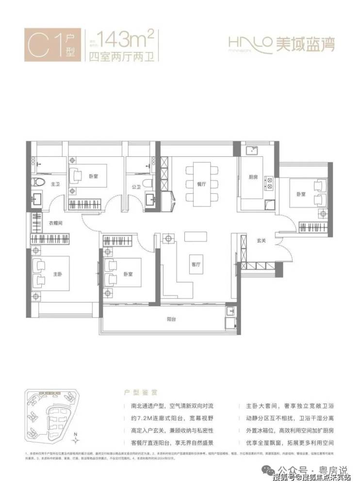 143㎡的4房2厅2卫,C1户型,竖厅南北通透格局,客厅4.2米开间,五开间朝南,客厅连接次卧出7.2米长的巨幕大阳台,U型厨房,卫生间干湿分离,得房率约77.13%(不含赠送),阳台主朝正南向。