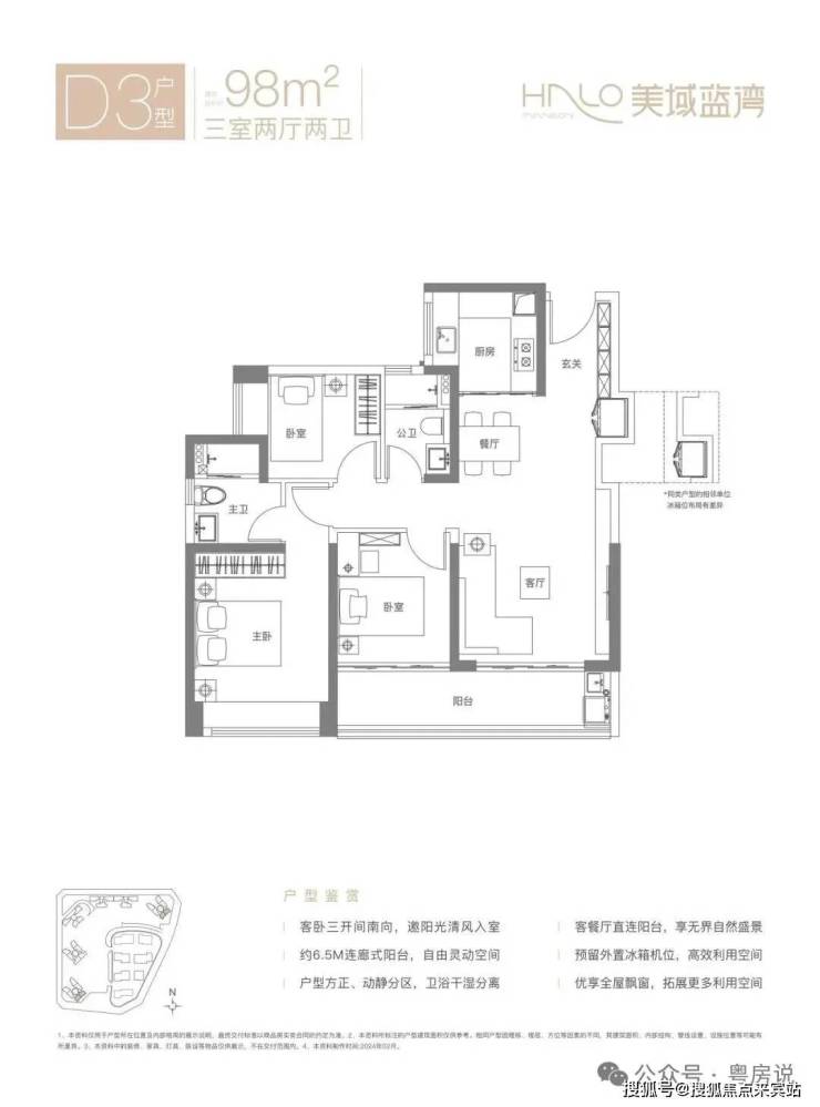 98㎡的3房2厅2卫,D1户型,经典竖厅格局,客厅3.7米开间,LDKB一体化设计,S墙设计预留冰箱卡槽位,动静分区,客厅连接次卧出6.5米长的大阳台,U型厨房,卫生间干湿分离,得房率约80.12%(不含赠送),西南或东北朝向。