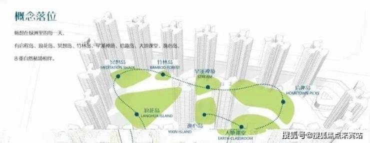 精心布局启程岛、浪花岛、冥想岛、竹林岛、旱溪禅境、拾趣岛、大地课堂、逸心岛 8大主题园林