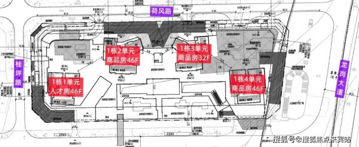 项目由深铁集团开发,总建筑面积约16万㎡,计容建筑面积约11.2万㎡,容积率6.1,绿化率40%,共由4栋总高32-46层的住宅组成,包含3栋商品房+1栋人才房,其中1栋1单元人才房46F,1栋2单元商品房46F,1栋3单元商品房32F,1栋4单元商品房45F。
