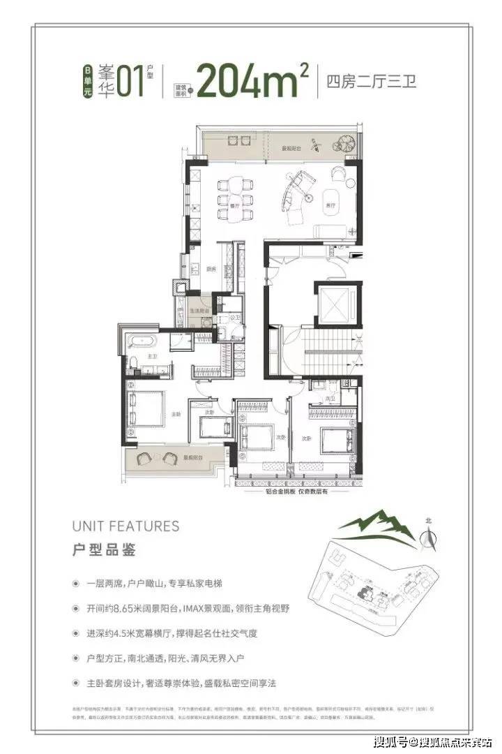 同样的专梯入户,豪宅感扑面而来,该户型为顶级大户型,四阳台设计,最大有10.55米的景观阳台和180度视野的餐客厅空间奢阔气场尽显,罕见的南北瞰景四阳台设计,让家的每个角落都能欣赏美丽的山景和城市景观。所有的开窗面都尽可能放大,客餐厅、书房、卧室、几乎都能享受超宽超大屏
