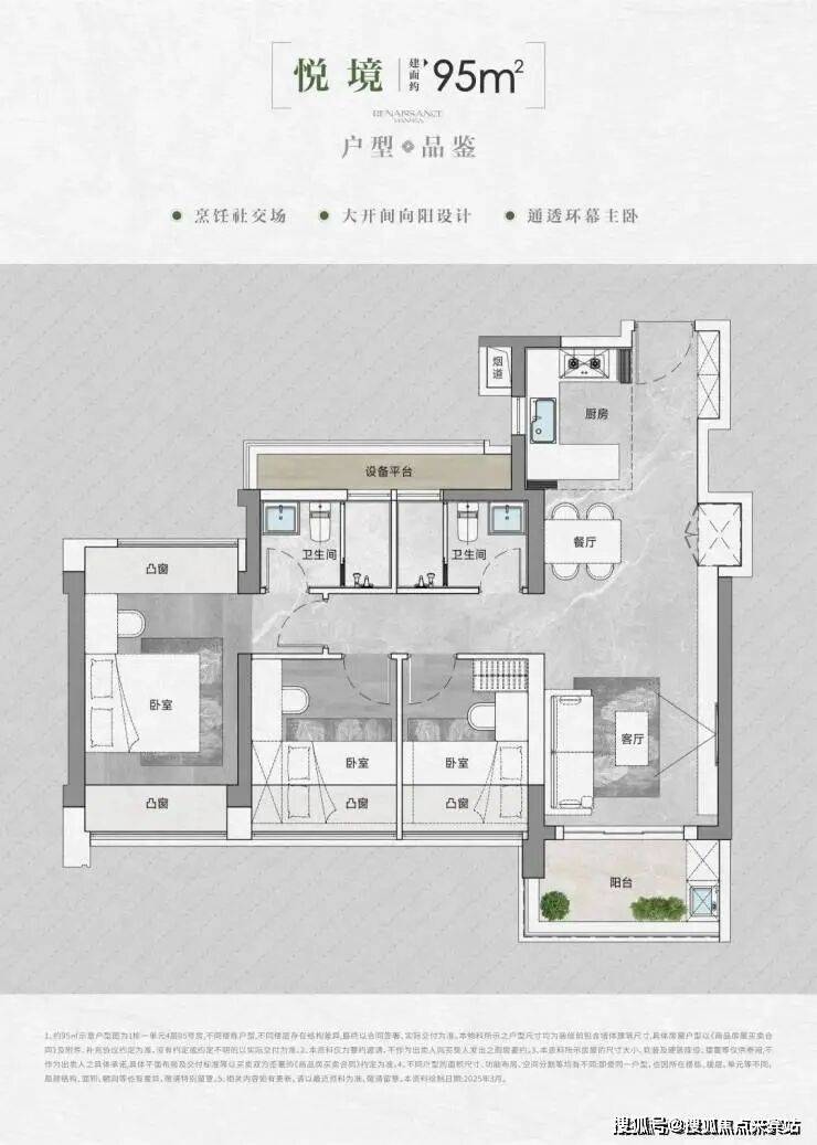 • 得房率:通过创新性的飘窗、双阳台改造、设备平台赠送等设计,实现平均94-96%的惊人得房率。