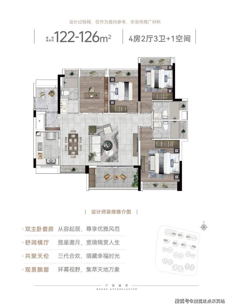 建面122-126平4+1房,双主套配置,四开间朝南采光,大横厅设计,全屋8个飘窗+入户花园+观景阳台+厨房窗户,整整11个采光面,所有卫生间都带飘窗。