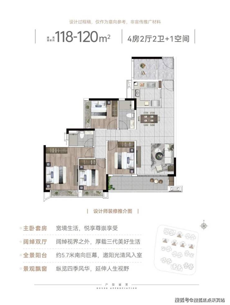 建面120平4+1房,入户处多了一个灵动空间,可改成5房,四开间朝南,全屋大飘窗设计,5.7米观景大阳台
