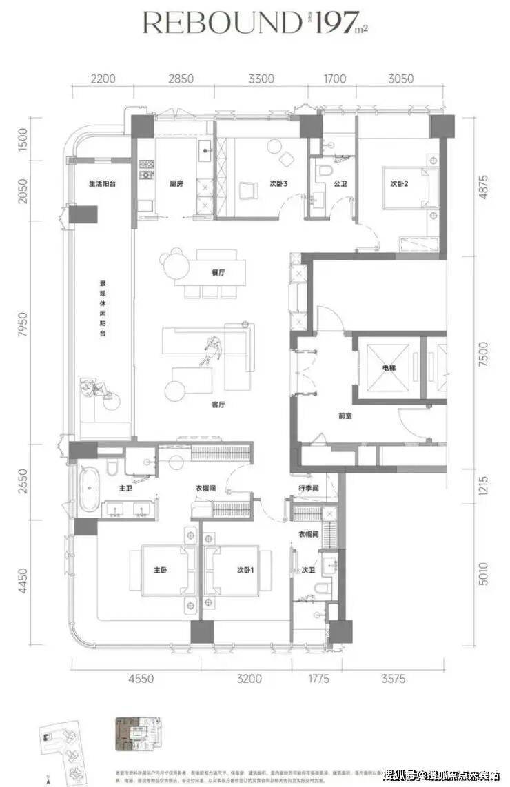 建面约197㎡户型为4房2厅3卫的正四房设计,全屋通透明厨明卫,豪气阔绰的客餐厅超大通厅,带来云端墅居的空间感。