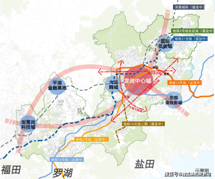 提到龙岗,大部分人脑海中首先浮现便是龙岗中心城,这个已发展30余年的板块,几乎成为了龙岗的代名词。本案所在的龙东片区距离龙岗中心城约5公里,临近地铁16号线龙东站,在龙岗“一轴、两带、三通廊”城市规划中,地铁16号线是特殊且重要的一条线路,它的开通是进一步落实东进战略的重要举措,将链接龙岗中心城、大运中心、坪山高铁中心三大板块,推动龙中居住区域板块整体向东外拓,建设“龙城2.0”居住区。