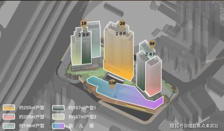 三栋高层住宅楼以优雅的C字形向南舒展,T3栋巧妙位于地块两侧,而T2栋型的建筑面积约255㎡的楼王则位于中心,构筑成一个引人注目的建筑集群,呈现出鲜明的天际线轮廓。项目采用内向型“都市谧境”理念,整体抬高约20米,将空中花园、地面景观、会所大堂,垂直立体折叠。