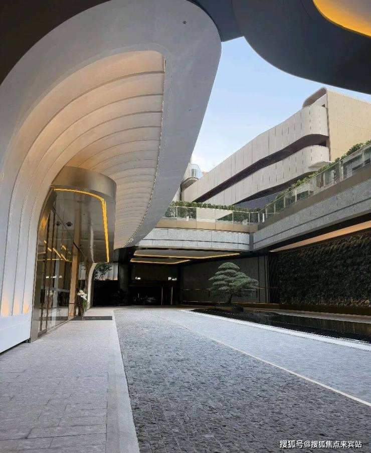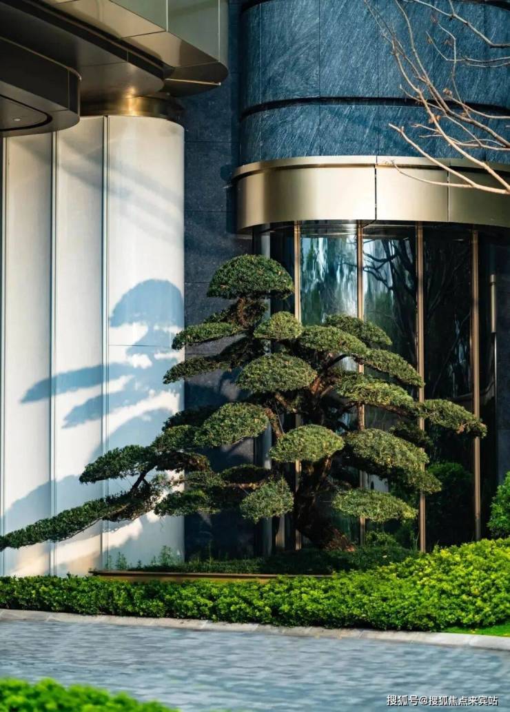 在下沉式庭院中央,一棵约5米高的迎客松巍然矗立,搭配普拉达绿的奢石背景墙,成为引人注目的景观焦点。它不仅是一道独特的风景线,更是岭南建筑特色“四水归堂”理念的重要体现。与无边界的流水相映成趣,营造出松韵、水波、月影交融的意境。罗汉雕塑、水景与玻璃幕墙巧妙融合,在阳光洒落的天井中,与自然展开一场静谧的对话。