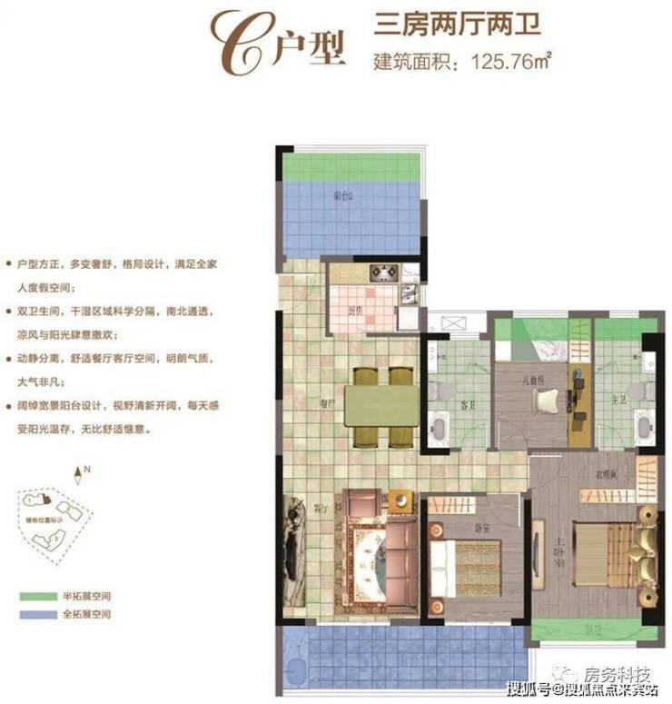C户型 三房两厅两卫 建筑面积为125.76㎡