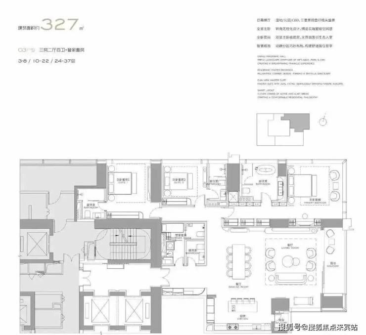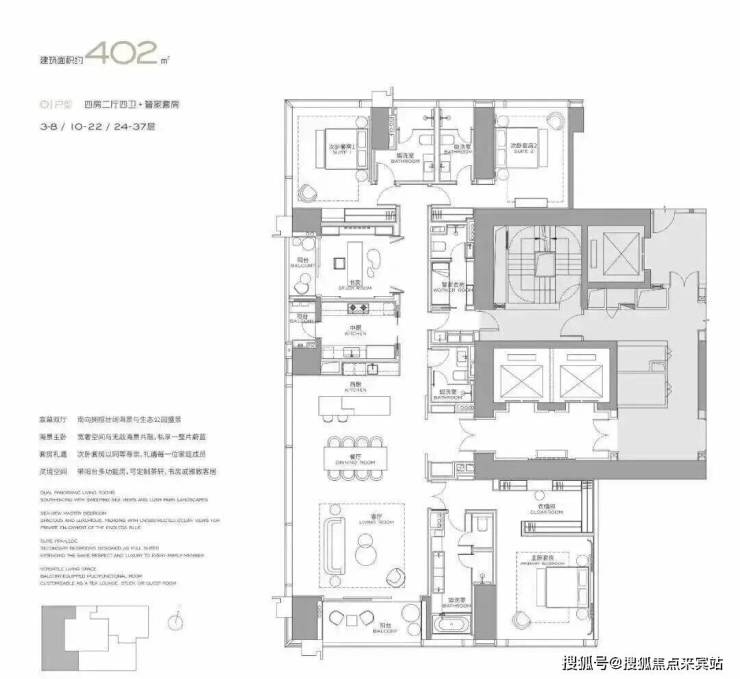 南北通透三面采光,顶奢总统套房规格,270°全景套房,享受湿地/公园/CBD景观,都是套房设计,更具私密性,中西厨分离。