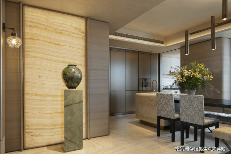 由餐厅踱步书房,动线开朗,纵深有度。柔韧纹理的透光玉石为空间增添温润的氛围,与端雅的青瓷器共同呈现现代和优雅的风格,给人宁谧的感觉。