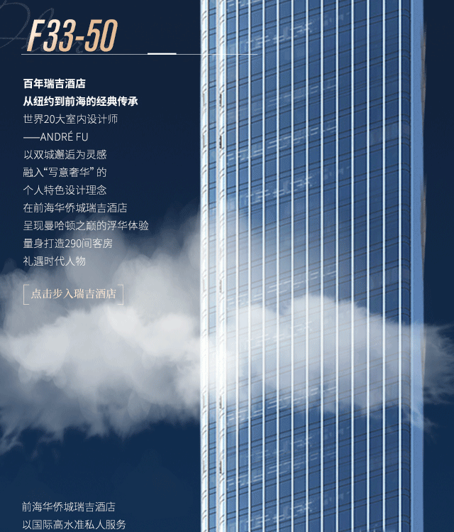 项目33-50F为瑞吉酒店,5-31F瑞湾府目前在售190-360㎡酒店式行政公馆,层高4.4米。