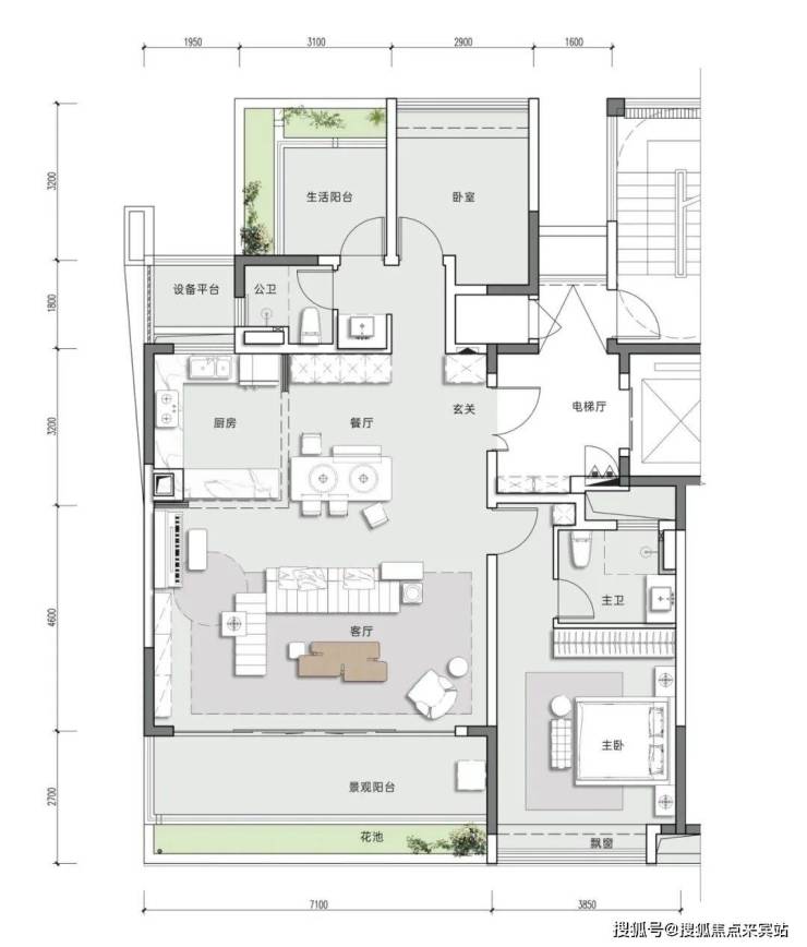亮点:南向客厅面宽7米进深4米,空间利用率高,L型厨房联动客厅,南向面朝景观公园带。