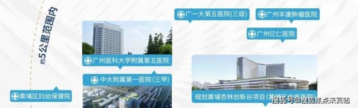 约5公里范围内多家三甲医院环绕:黄埔区中医医院(三甲,建设中),距离项目约500米(数据来源:百度地图直线实测),打造黄埔区首个国家级中医药领域示范高地;中大附属第一医院东院区(三甲);广州医科大学附属第五医院(三甲)等。