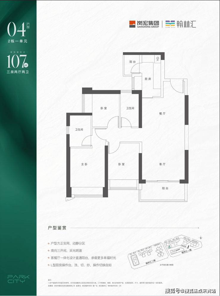 采用竖厅格局,客厅开间3.4米,实现LDKB一体化设计。L型厨房配备小生活阳台,卫生间采用三段式分离设计。得房率约71%(不含赠送部分),朝向为西南或东南。
