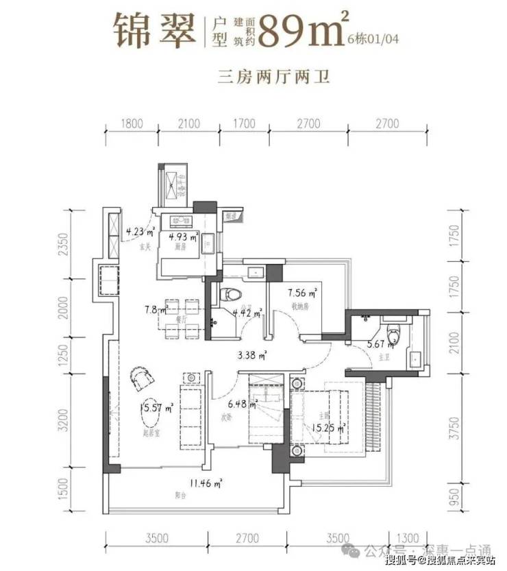 89㎡的3房2厅2卫,6栋02/03户型,设计的是经典竖厅格局,客厅3.5米开间,LDKB一体化,S墙设计预留冰箱卡槽位,三开间朝南,动静分区,主卧+次卧270°无柱转角飘窗,分别做到了主卧15.25㎡/次卧7.56㎡/次卧6.48㎡(包含墙体飘窗),U型厨房烟道外置,卫生间干湿分离,得房率约97.47%(包含赠送),客厅连接次卧出大阳台约11.46平,西南或东南朝向。主要区别在于次卧跟主卫空间。