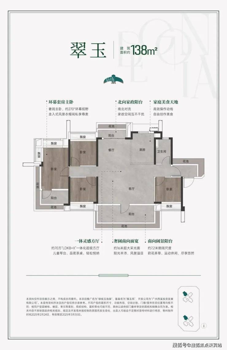 绿城玉海棠由绿城中国开发,位于广州番禺广场核心区,紧邻区政府中轴,距离番禺区政府仅约200米。项目占地约1万平方米,总建筑面积约3万平方米,容积率3.0,规划两栋31-32层高层住宅,总户数220户,车位配比1:1.5。主推建面约100-140平方米的精装四房,定位高端改善型住宅,户型设计强调南北通透与高使用率(约110%-130%)。