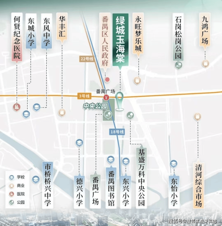 绿城玉海棠自带番禺广场地铁站 E 口,这里是 18 号线、22 号线、3 号线以及规划中的 17 号线的交汇站点 。