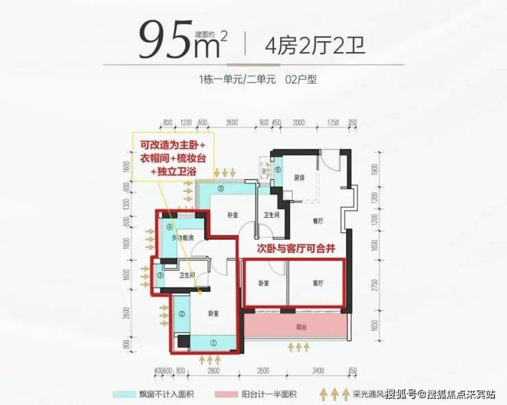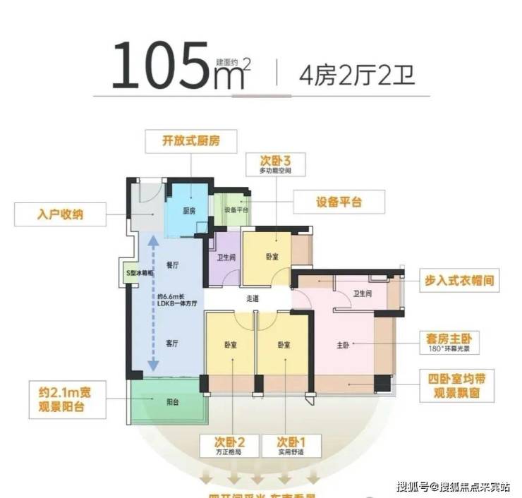105㎡的4房2厅2卫:设计的是经典竖厅格局,客厅3.6米开间,四开间朝南,4个卧室分别做到了主卧17.59㎡/次卧9.5㎡/次卧8.93㎡/次卧7.75㎡(包含墙体飘窗),公卫带1个3.12㎡的设备平台,得房率约:100%(包含赠送),东南朝向看观澜河景观。