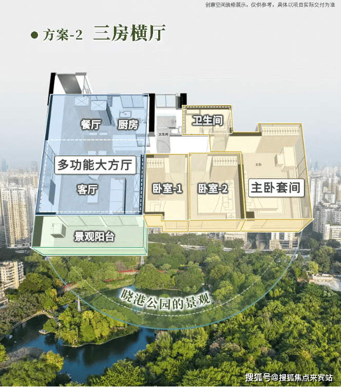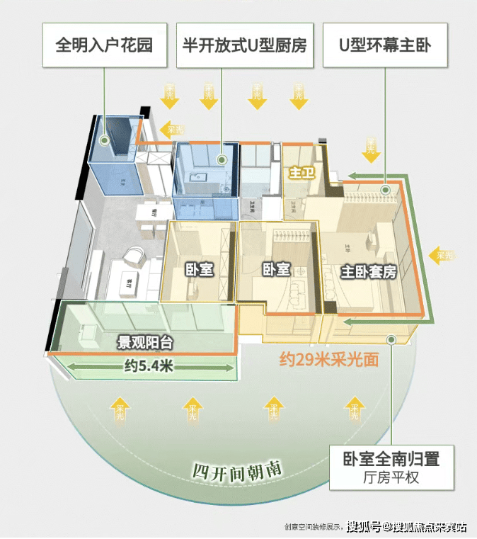 约5.4米景观阳台+U型环幕主卧+全卧室南向归置等,尽可能打开的尺度,向南一推窗即超500米无遮挡、约17万方的晓港公园。