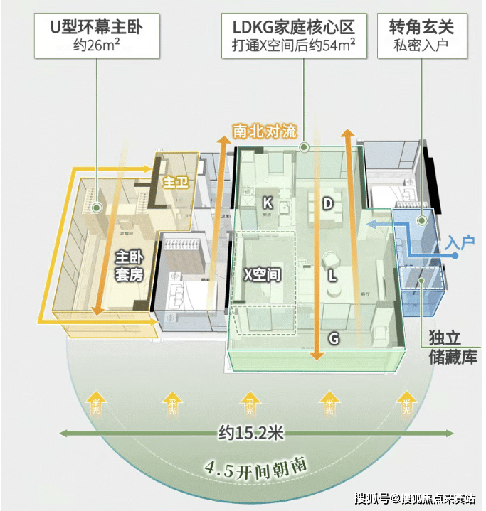 与此同时,厨房、卫生间功能区北向归置,家庭动静秩序感更强。
