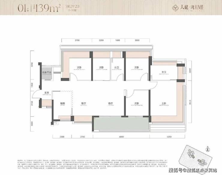 139平则做成了五房,纯板式结构,西南向有一线海景,还配了270度飘窗。双套房设计适合三代同堂的家庭,独立的家政间也考虑到了实际居住需求。