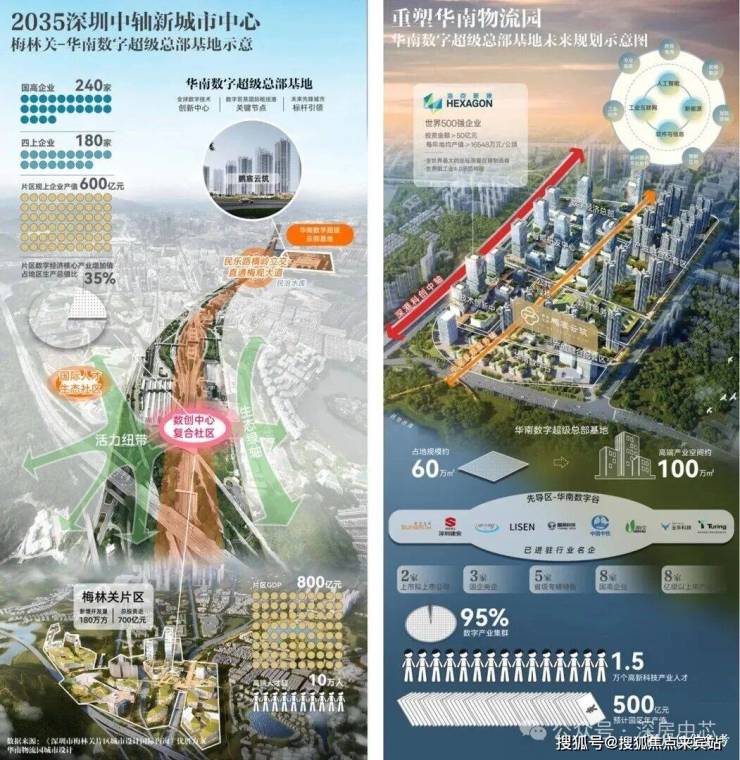 ④深圳发展中轴,华南数字超级总部基地、星河world总部基地、坂雪岗科技城、北站产融结合示范区、梅彩新一代信息科技,连成深圳中轴含金量置顶的价值金线。