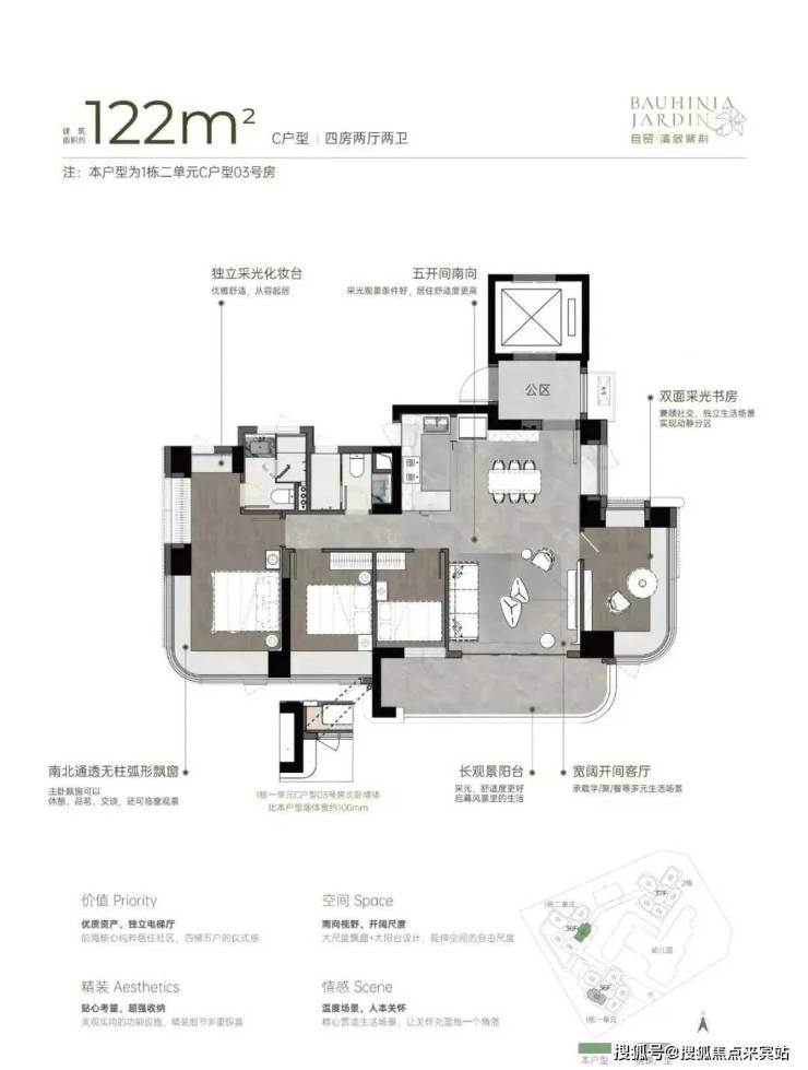 双龙抱珠户型,书房分布于客厅另一侧,且难得是双面采光+270°景观视野。主卧南北通透,且拥有十分开阔的景观面。贯通式阳台联通客厅以及靠近动区的次卧,实现长观景阳台