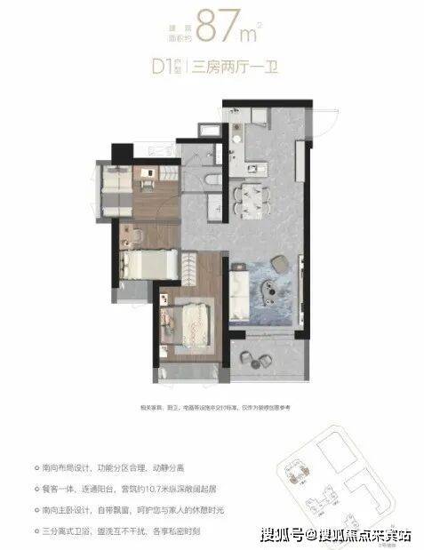 D1户型87㎡三房两厅一卫:10.7m纵深紧凑南向三房,通风采光极佳。