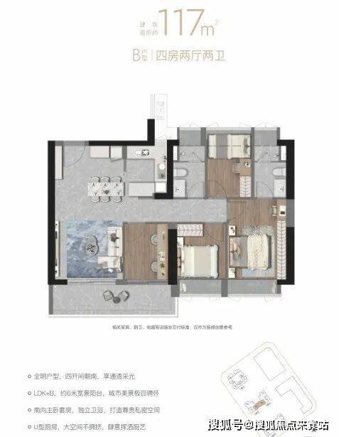 B户型117㎡四房两厅两卫:南向全明四房LDK+B设计,宽景阳台,拥揽四季美景。