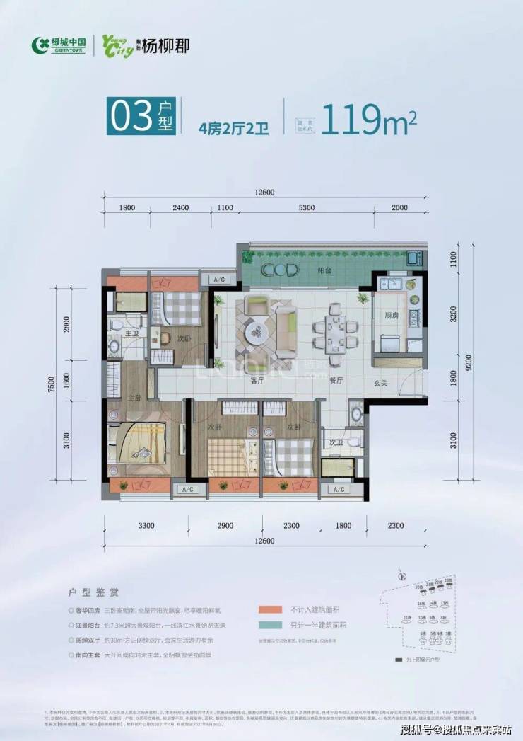 在售户型:主力建面约 101㎡三房、115-119㎡四房,全明格局,主打高拓展空间、大面宽阳台设计,全部精装现房交付。