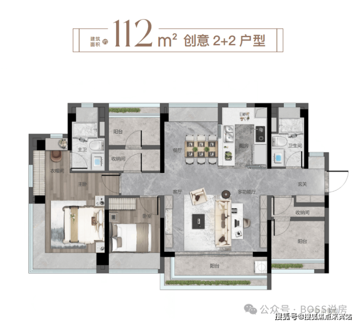 路劲美的隽樾府建面约 112㎡户型属于 LDKB 一体化大方厅搭配 2+2+X 的设计。