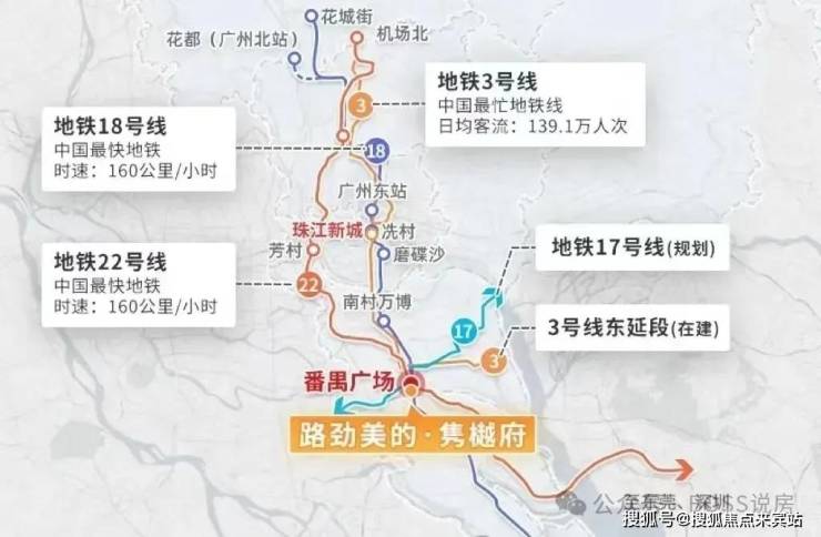 项目距离地铁番禺广场站约 900 米距离,囊括已开通的广州地铁3号线、18 号线、22 号线,3号线东延段(在建中),未来规划有广州地铁 17 号线,5 轨汇聚于此,如此便捷的交通路网是其他板块难以比拟。