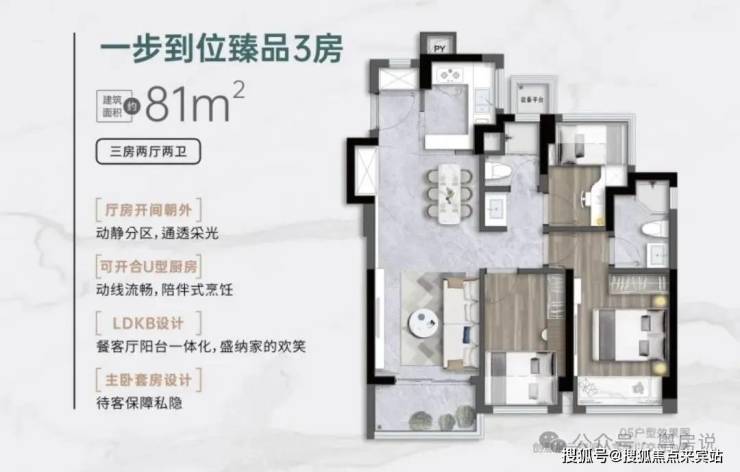 设计的是竖厅格局,客厅3.05米开间,LDKB一体化,S墙预留冰箱卡槽位,动静分区,U型厨房,卫生间三段式干湿分离还带1个设备平台,得房率约91%(包含赠送),实用面积约73.71㎡,正东或正南朝向。