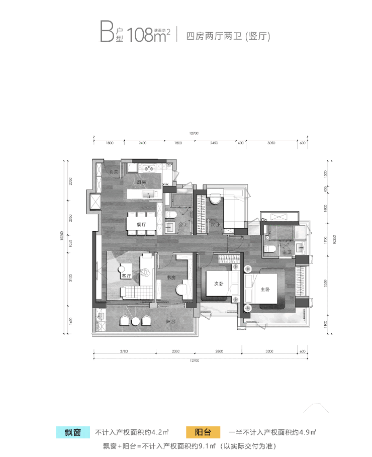 建筑面积约108㎡户型-4房2卫(竖厅)