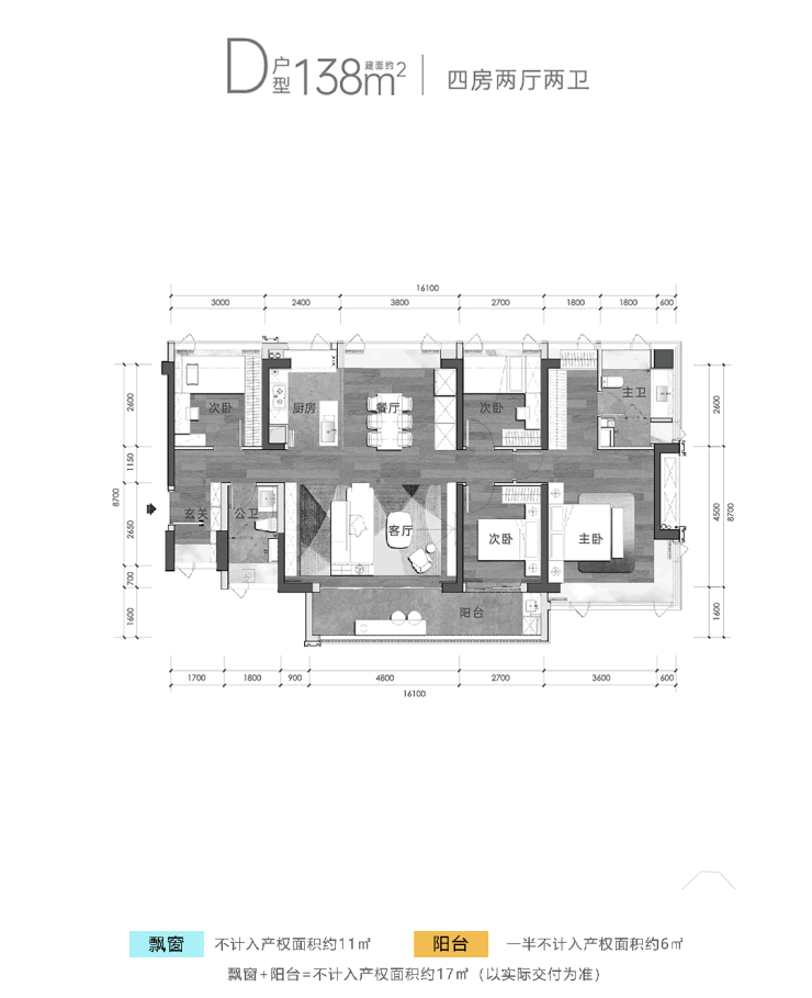 建筑面积约138㎡户型-4房2卫 大客厅、大阳台、大卧室,特别适合改善人群,尤其是二胎家庭,早一步享受三代同堂的的天伦之乐,免去换房烦扰。