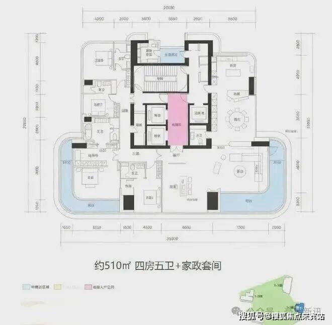 其中标准层为211-218-302-370-510㎡的3-4房,另外顶层复式有518-655-938㎡户型。