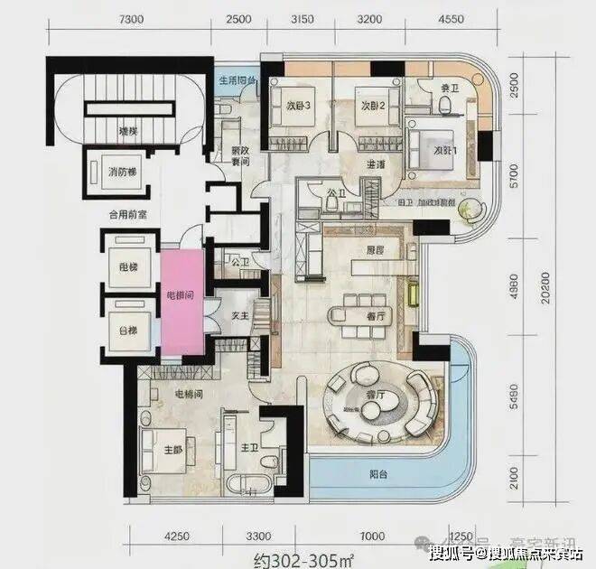 一层两户,经典大平层:约303㎡主力户型,空间布局方正大气,功能完备。